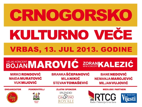 У Врбасу се у суботу, 13. јула организује Црногорско културно вече. Манифестацију организује Црногорска културна мрежа, а покровитељ је општина Врбас. У програму учествују народни гуслар
