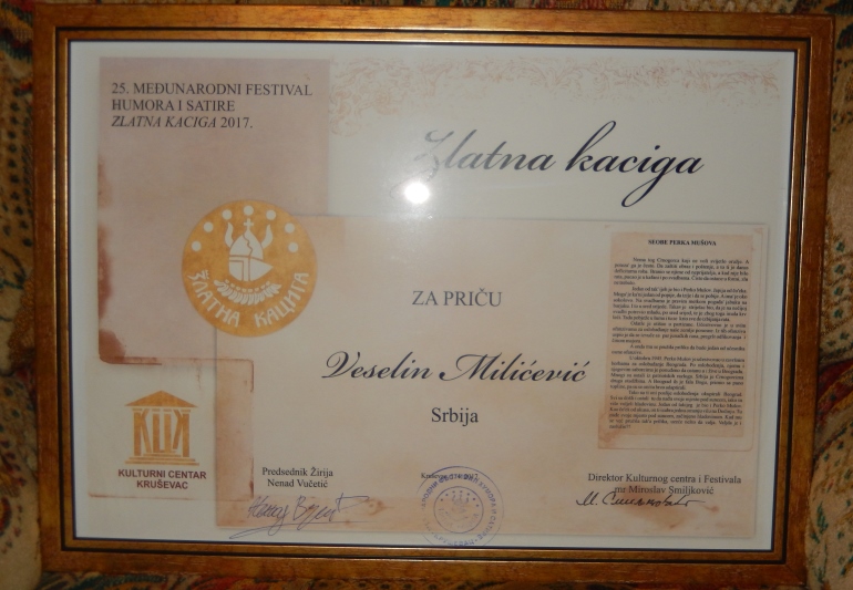 Веселину Милићевићу, сатиричару, афористичару и дечијем песнику из Врбаса, свечано је уручена прва награда на 25, јубиларном Међународном фестивалу хумора и сатире "Златна кацига 2017", који је одржан у Крушевцу.