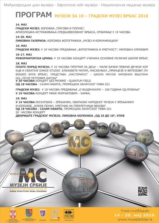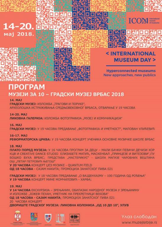Од 14. до 20. маја, а у Врбасу већ од 11. маја, очекују се занимљиве изложбе, предавања, концерти, радионице, промоције и други пратећи програми и садржаји за све генерације. Централна тема овогодишње манифестације „Хиперповезани музеји: Нови приступи, нова публика“ посебно ће нагласити важност данашњих многобројних средстава комуникације и тиме отворити могућност новог приступа у изналажењу нове публике и још отворенијој презентацији културних садржаја.