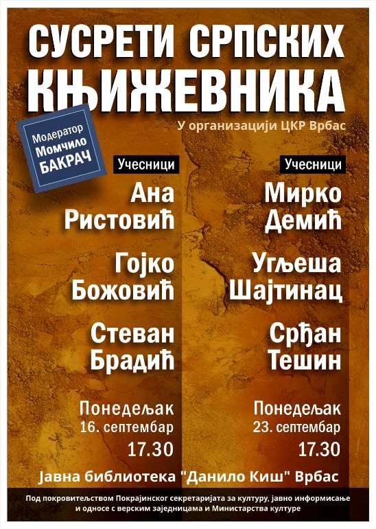 "Манифестација 'Сусрети српских књижевника' дешава се у Врбасу по четврти пут у континуитету, а започета је још давне 2007. под фирмом 'Априлски сусрети писаца'; у новом циклусу април је у септембру, каткад октобру, и већ се дешава да долазе у госте и учесници из оног давног пилот турнуса, овом приликом је то Угљеша Шајтинац, а пре пар јесени био је ту Јовица Аћин, што све иде у прилог идеји да цела ствар постаје традиционална. Згода се збива у две засебне сесије, у првој наступају песници, у другој прозаисти. Реч је о елитној књижевности и о врхунским ствараоцима... Аутори неће само читати делове из свог опуса, говориће о себи и свету, о драгоценој вештини читања, о писању које из читања извире, те о својим узорима, иницујатичким моментима, о свом стилу и маниру и књижевним поступцима. Одговараће на брза питања модератора и агилне публике. Дакле, у пар речи – у овој згоди наступа књижевност лично", најавили су организатори.