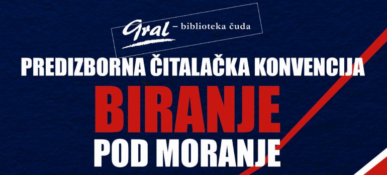 Народна библиотека "Данило Киш" и Издавачка кућа Клио организоваће у петак, 22. априла, ПРЕДИЗБОРНУ ЧИТАЛАЧКУ КОНВЕНЦИЈУ - БИРАЊЕ ПОД МОРАЊЕ, сусрет издавача и читалаца на којем ће се говорити о писању и писцима, о уредницима и издавачима, о читању и читаоцима, као и о романима из едиције Грал.