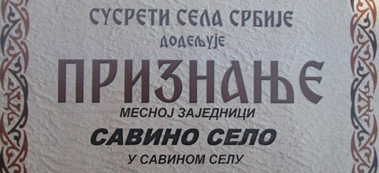 Месна заједница Савино Село добила је Признање за примерну организацију рада и стваралаштва у изградњи села на регионалним СУРЕТИМА СЕЛА СРБИЈЕ, који су одржани у Црној Бари у Мачви. Традиционалне сусрете организовала је Културно - просветна заједнице Србије.